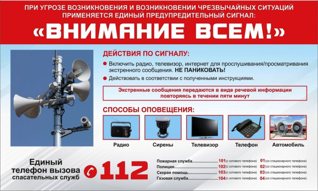 Доведение сигналов гражданской обороны осуществляется путем подачи предупредительного сигнала «ВНИМАНИЕ ВСЕМ!», предусматривающего включение сирен, прерывистых гудков и других средств громкоговорящей связи с последующей передачей речевой информации.